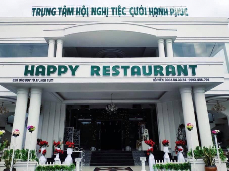 Nhà hàng tiệc cưới Happy là nhà hàng tiệc cưới ở Kon Tum tuy mới nổi nhưng được rất nhiều người lựa chọn làm nơi tổ chức đám cưới. Nhà hàng có 2 sảnh gồm 2 tầng khác nhau. Nhà hàng có phong cách khá đơn giản nhưng vẫn rất sang trọng và ấm cúng.